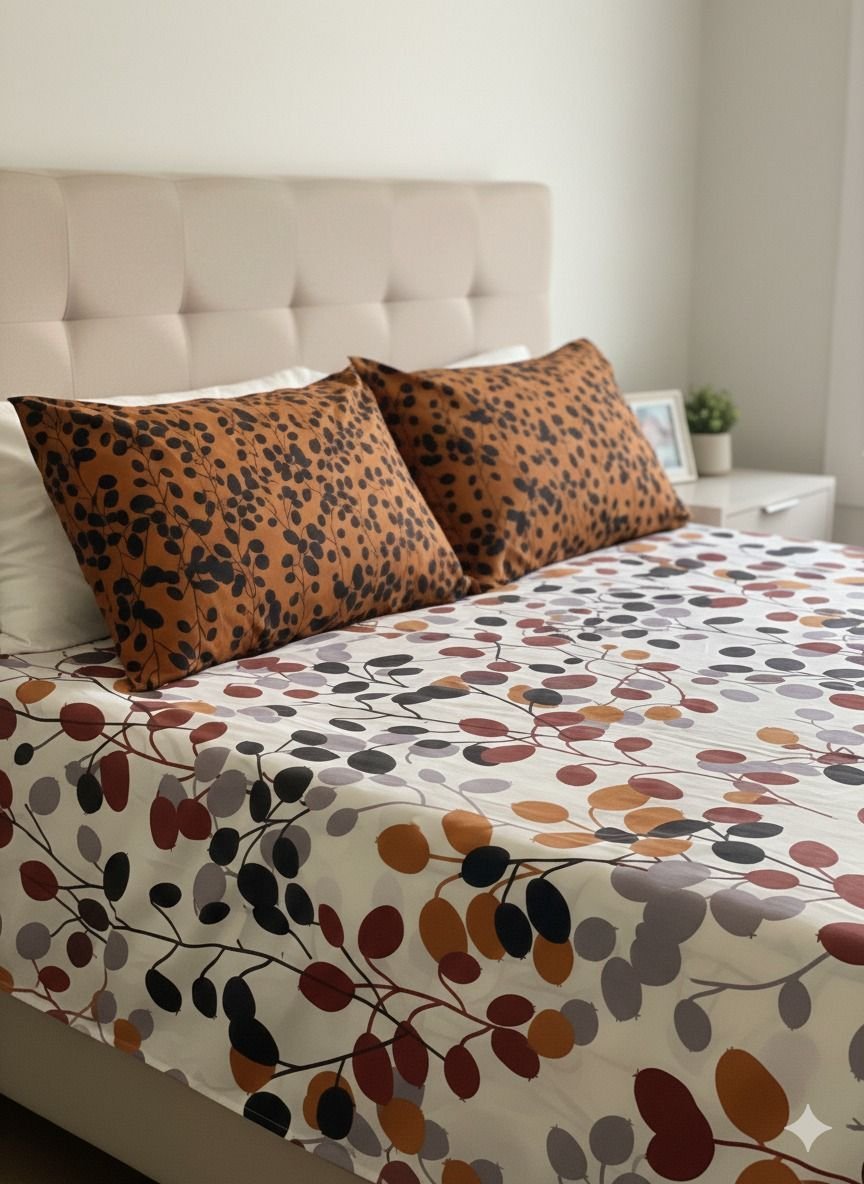 ✨ Bring warmth and elegance to your bedroom ✨Inspired by the beauty of autumn, this king size bedsheet features a stylish leaf pattern in rich brown, rust, and neutral tones. The modern earthy design adds a cozy yet sophisticated touch to any bedroom décor.